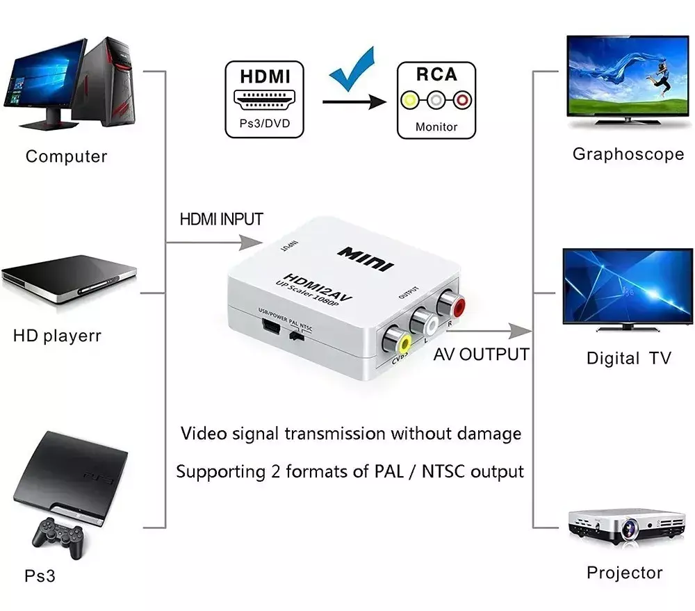 Convertí fácilmente la señal digital HDMI de tus dispositivos modernos a señal analógica RCA con este práctico conversor HDMI a RCA, ideal para conectar consolas, reproductores, notebooks, decodificadores o cualquier equipo HDMI a televisores antiguos, proyectores o monitores con entrada RCA.