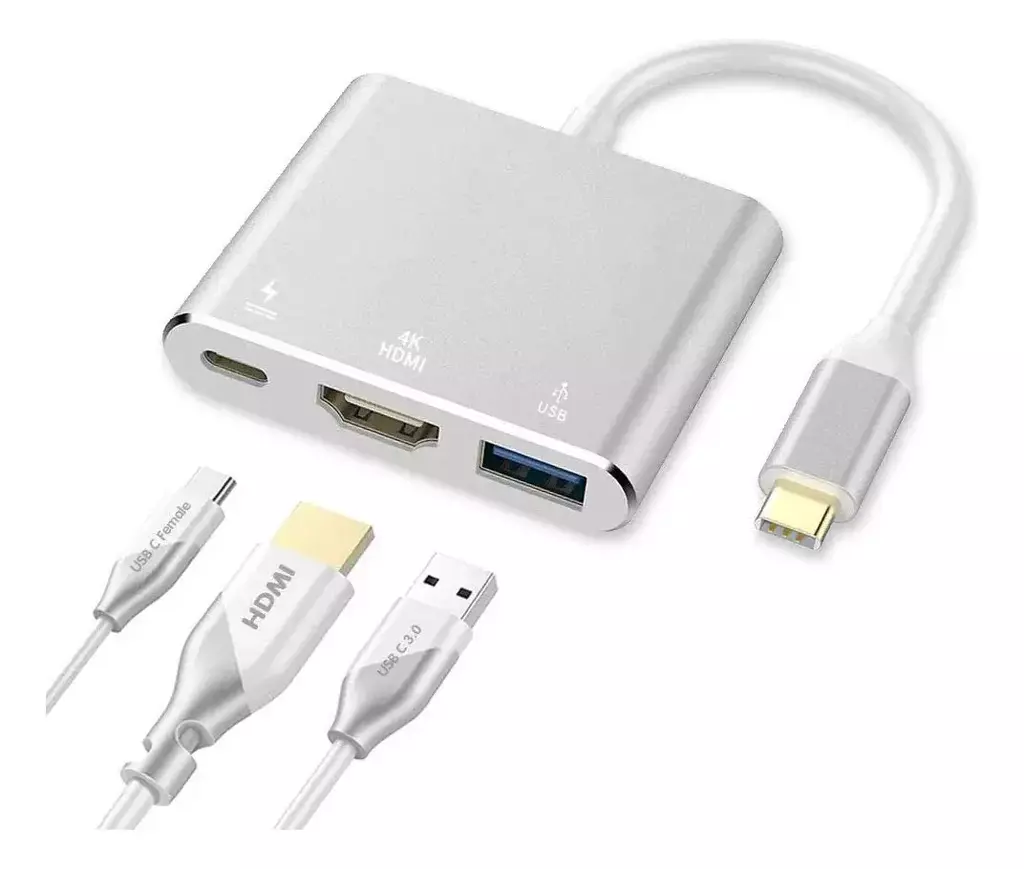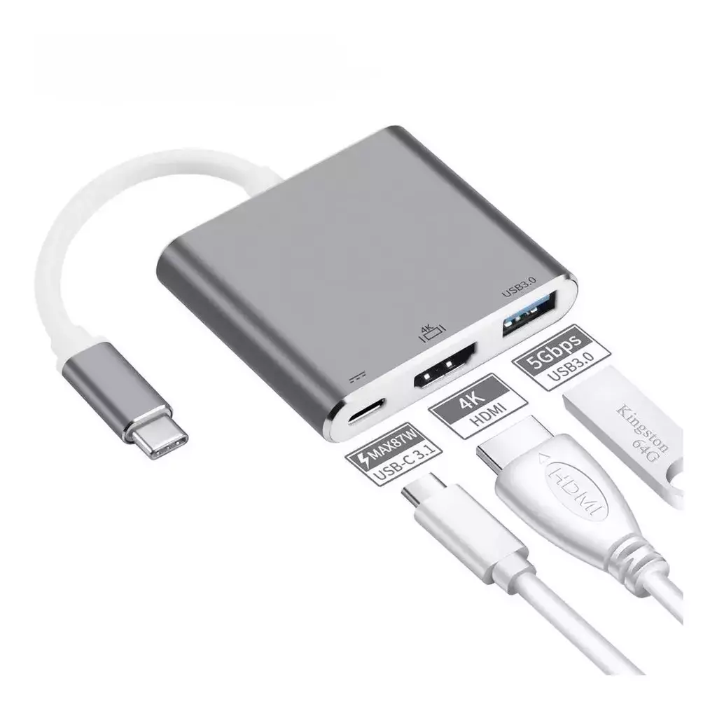 El adaptador Aoweixun VS-216 es la solución ideal para ampliar las posibilidades de conexión de tu notebook, tablet o dispositivo con puerto USB-C. Te permite conectar un monitor o TV mediante HDMI, un periférico USB-A y cargar el equipo simultáneamente por USB-C, todo desde un único puerto.
